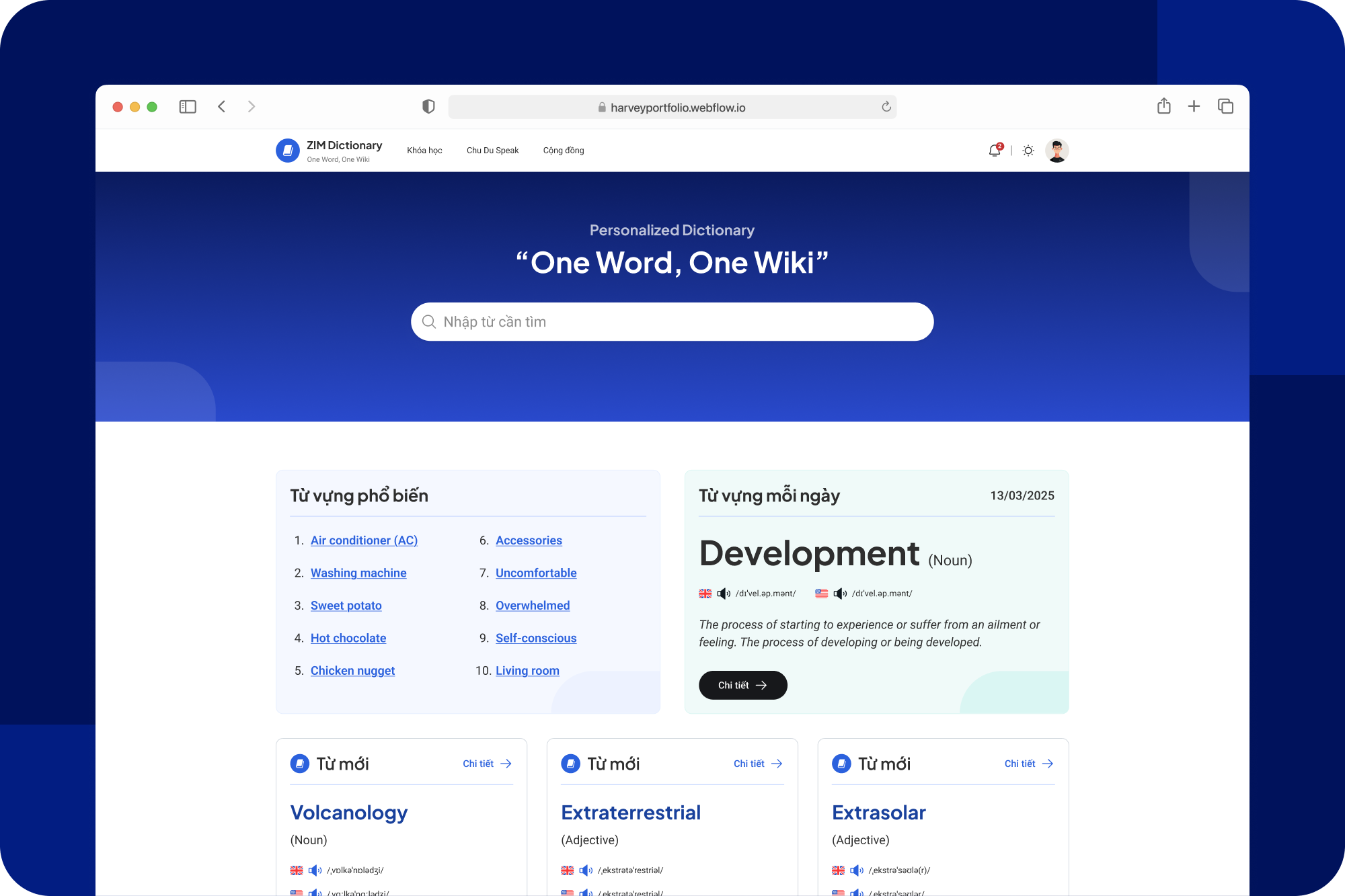 As a product designer, my goal was to reimagine how Vietnamese learners connect with English vocabulary. ZIM Dictionary is Vietnam’s first AI-powered English dictionary — designed to go beyond simple definitions by offering deep, wiki-style explanations that make learning more intuitive and memorable.